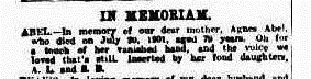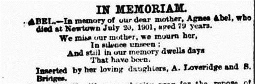 John died on 25th January 1885 in Newtown, New South Wales. Agnes Robley died in Newtown on the 20th July 1901 and is buried in the Rookwood Cemetery, Auburn, NSW.
