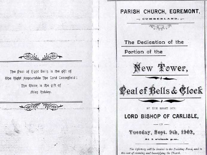 At 3 pm.,on Tuesday the 9th. Of September 1902,the singing of the hymn 'All people that on earth do dwell' heralded the service of dedication of a portion of the new tower, peal of bells and a clock for the church of St. Mary and St. Michael, Egremont in West Cumberland,by the Lord Bishop of Carlisle. The peal of bells was the gift of Lord Leconfield and the clock the gift of Miss Isabella Robley of the nearby village of Beckermet.