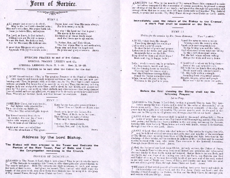 Another hymn was specially written to commemorate the occasion by Canon Rawnsley, 'Angel voices from the steeple throbbing through the sunlit air'.