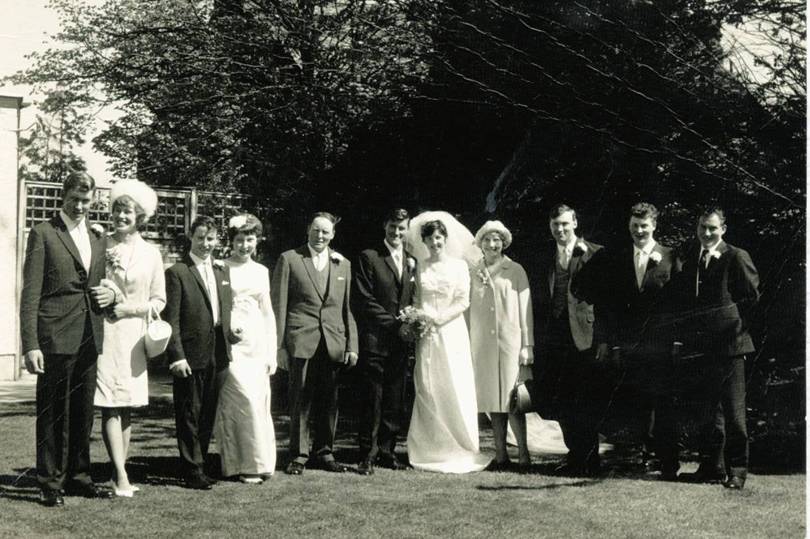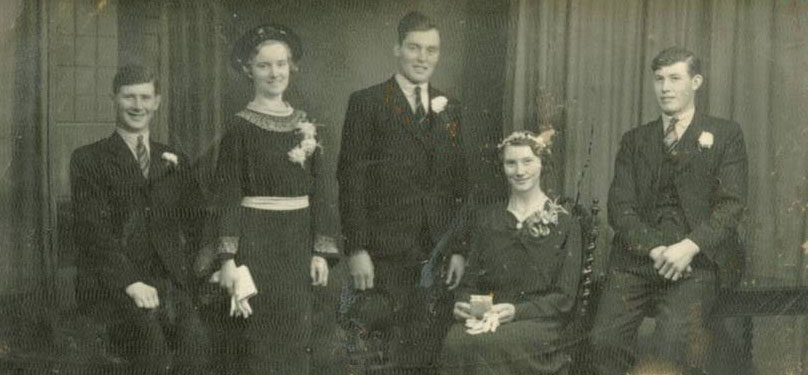 The bridal party after the marriage, at Cumwhitton Church, on 10th November 1937, of Mr. Richard Armstrong, son of Mr. and Mrs. Armstrong, Roadhead, and Miss Margaret Maud Robley, daughter of Mr. and Mrs. Robley, Low Northsceugh.